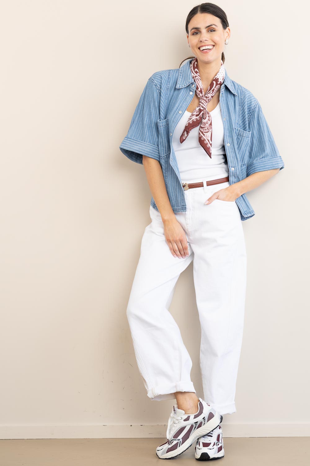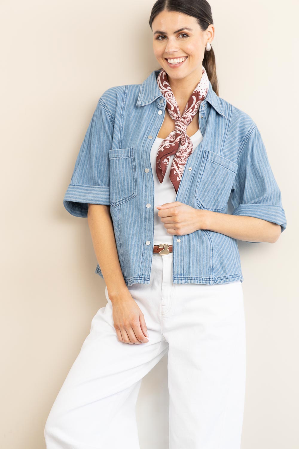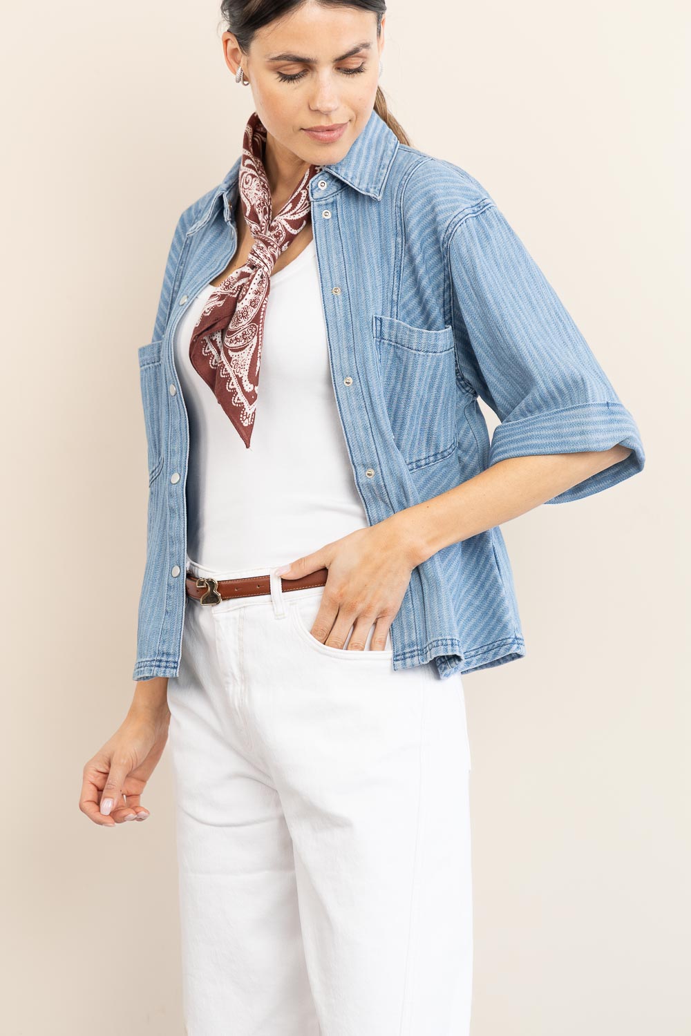- Denim blouse with pinstripes