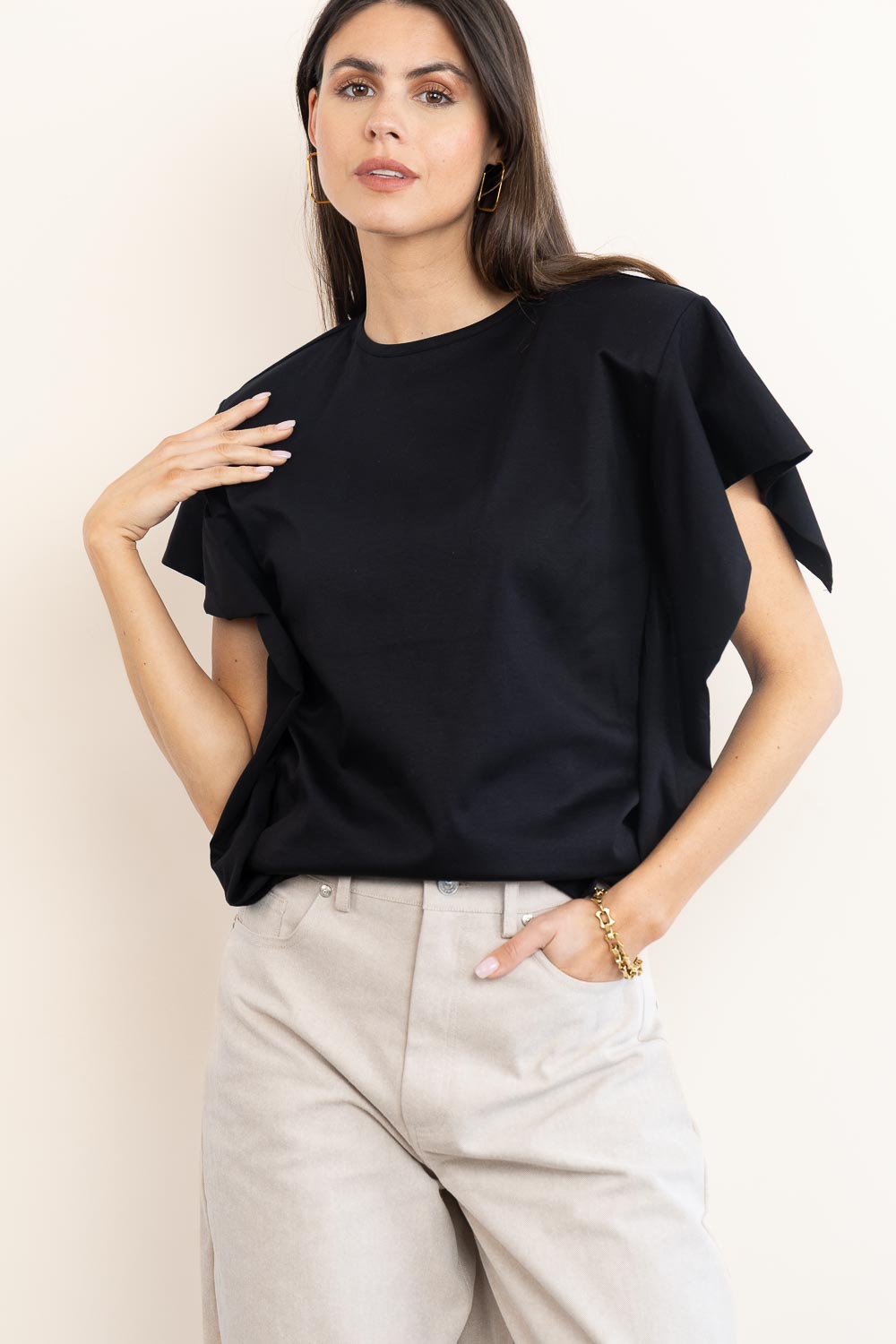 - Flared short sleeves